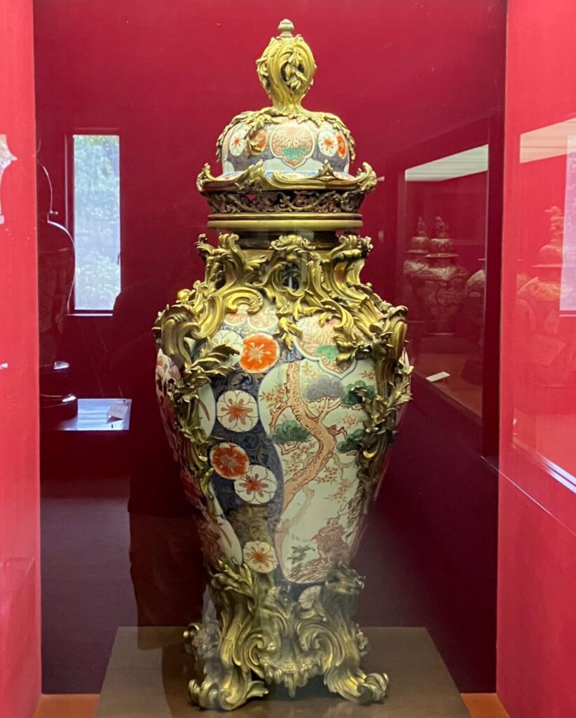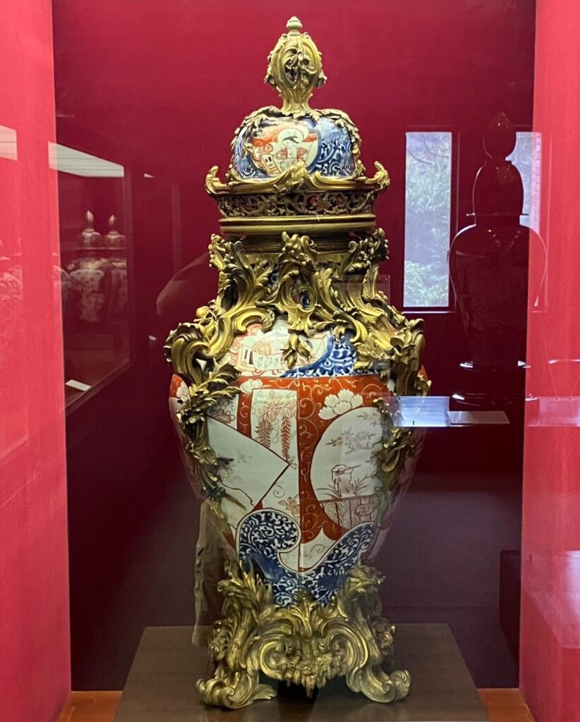 このように、室内装飾品として珍重された伊萬里焼には大作が揃っていますが、その中でも特に、18世紀前期の華麗な蓋付大壺を中心に、この部屋は展示されています。これらの大壺は、染付の上に上絵具で彩色し、さらに金彩で装飾されており、その華やかさから「金欄手」とよばれる様式の製品です。文様を器面にくまなく描き込んで豪華に彩色するこの作風は、18世紀におけるヨーロッパ向けの輸出品の大きな特徴で、天井の高い居館を飾るにふさわしいものと言えましょう。