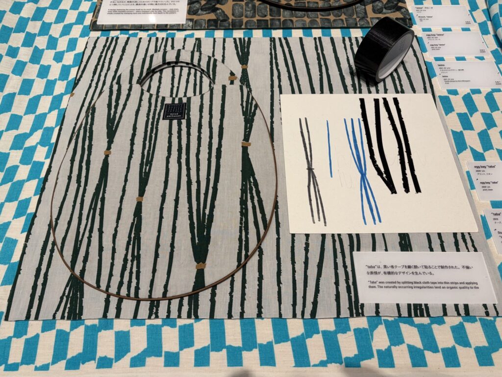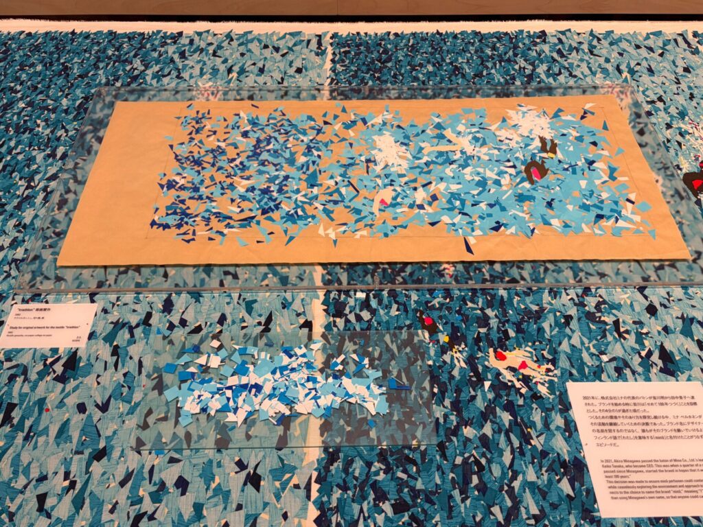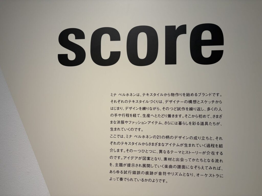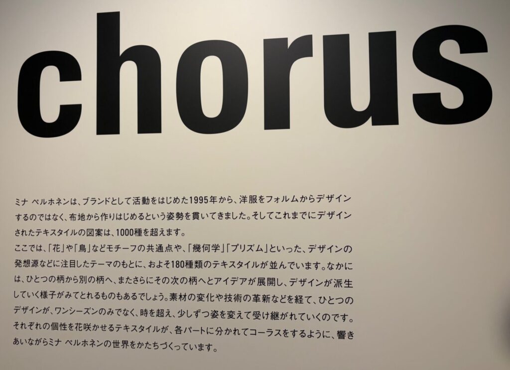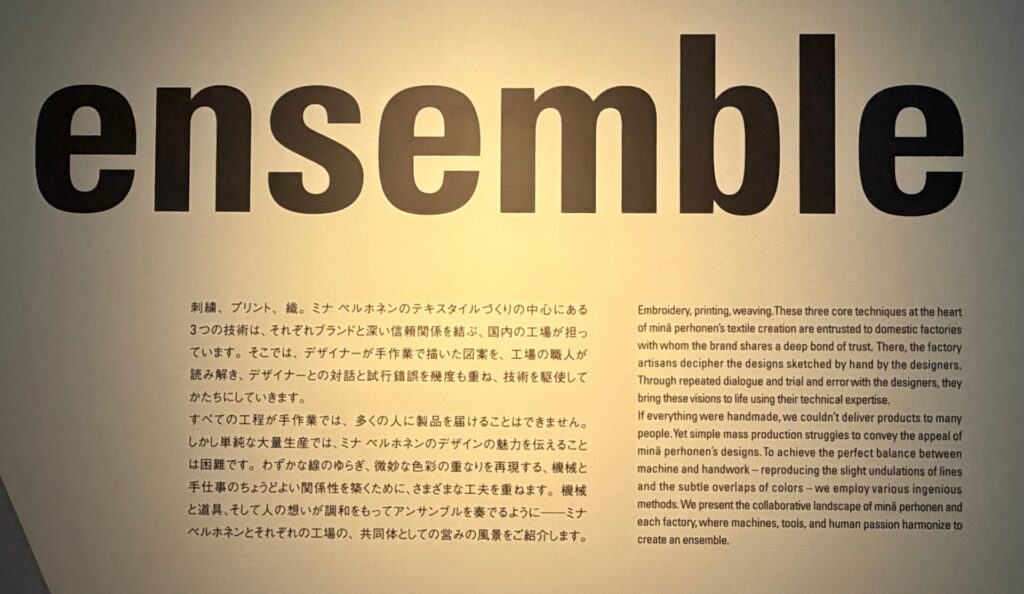 「ミナ ペルホネンは、ブランドとして活動をはじめた1995年から、洋服をフォルムからデザインするのではなく、布地から作りはじめるという姿勢を貫いてきました。そしてこれまでにデザインされたテキスタイルの図案は、1000種を超えます。」という説明があった。
