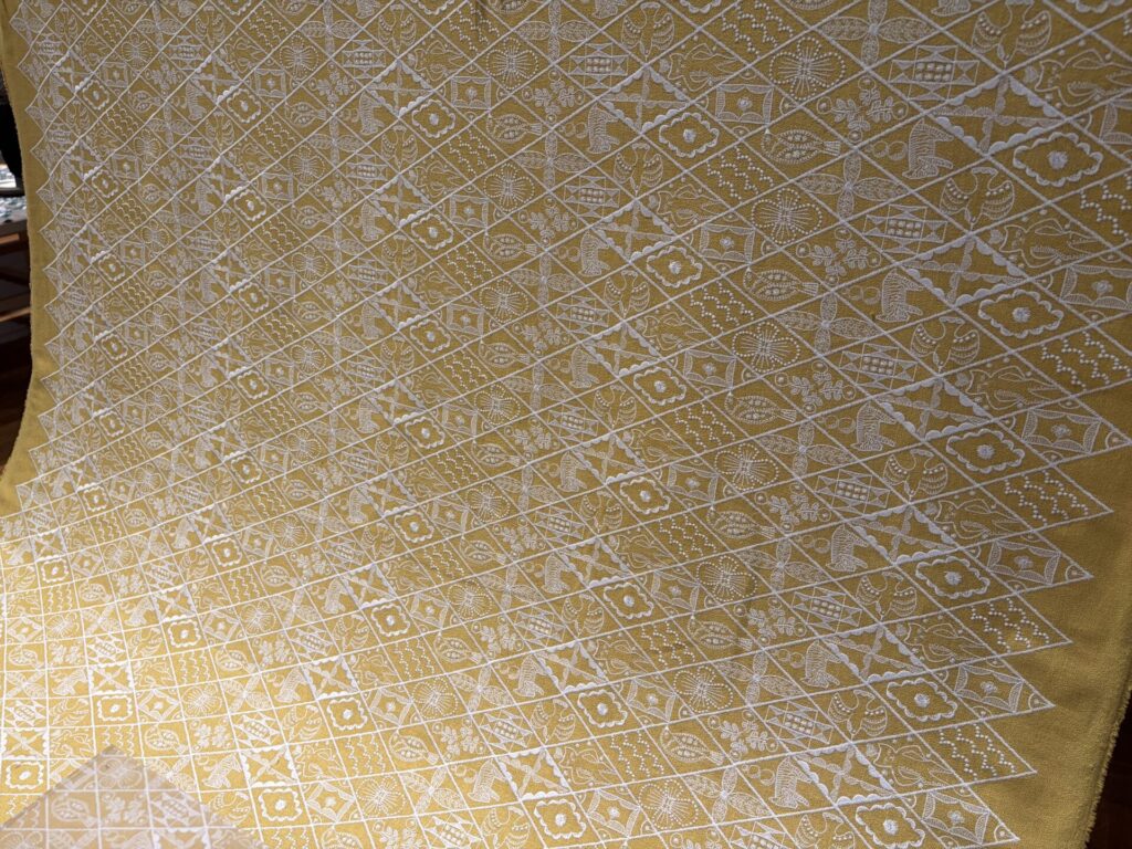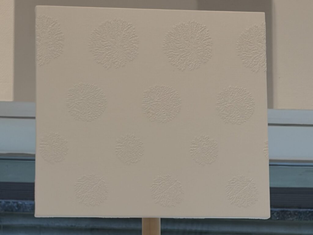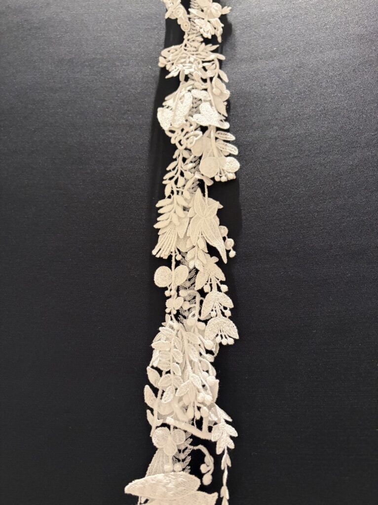 右側の白い生地が「水溶性の生地」で、この生地を溶かす工程を経て、刺繍されたモチーフだけが浮かぶ立体的なレースとなる、ということのようだ。↓