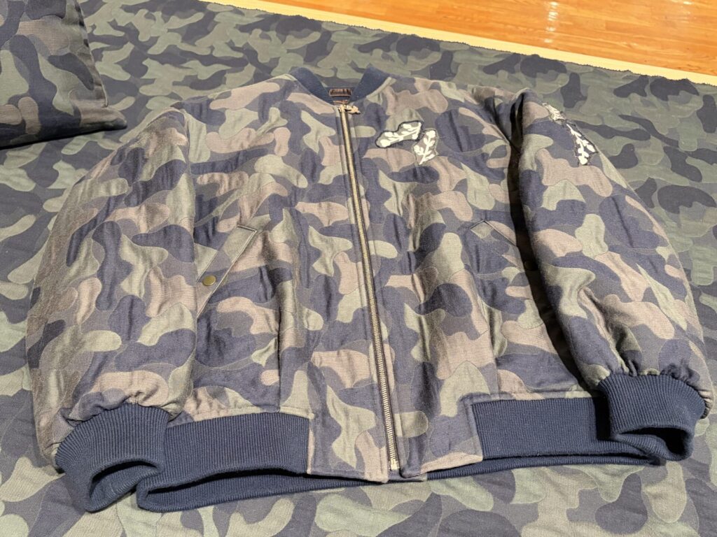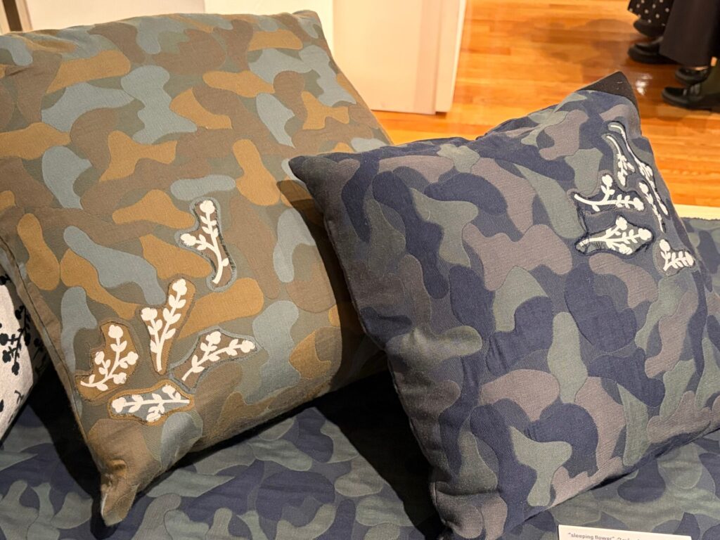 「二重織の構造をもつテキスタイルで、ジャカード織による迷彩柄の生地の下に、白い花の図案が一面に織り込まれた生地がひそんでいる。
