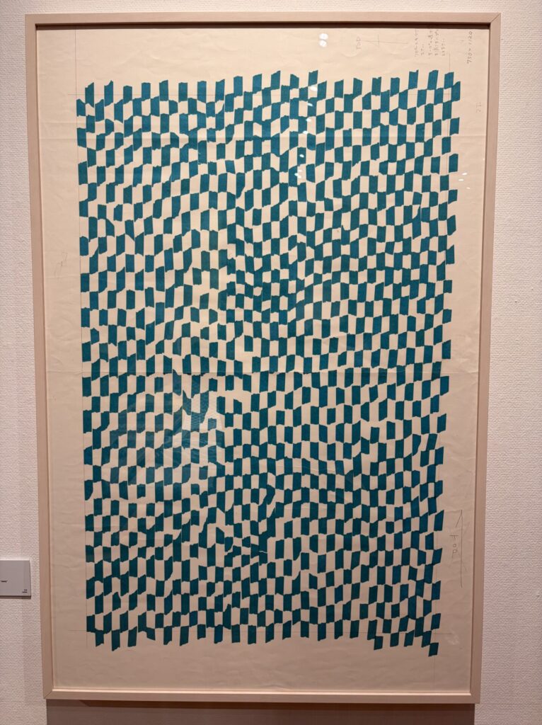 「プリントによるテキスタイルであるこの作品は、青いマスキングテープを手でちぎり、紙に貼り付けて、不規則な格子状に模様を描くようにして制作された原画から生まれた。今でこそ、さまざまな色や柄のマスキングテープが文房具として販売されるが、もともとは工業用の製品として開発されたもので、色数も僅かだった。初めて青色のマスキングテープを目にした田中景子が、ひとつの文房具を創造のための大切な要素として活かし、アートワークへと育てたデザインである。
