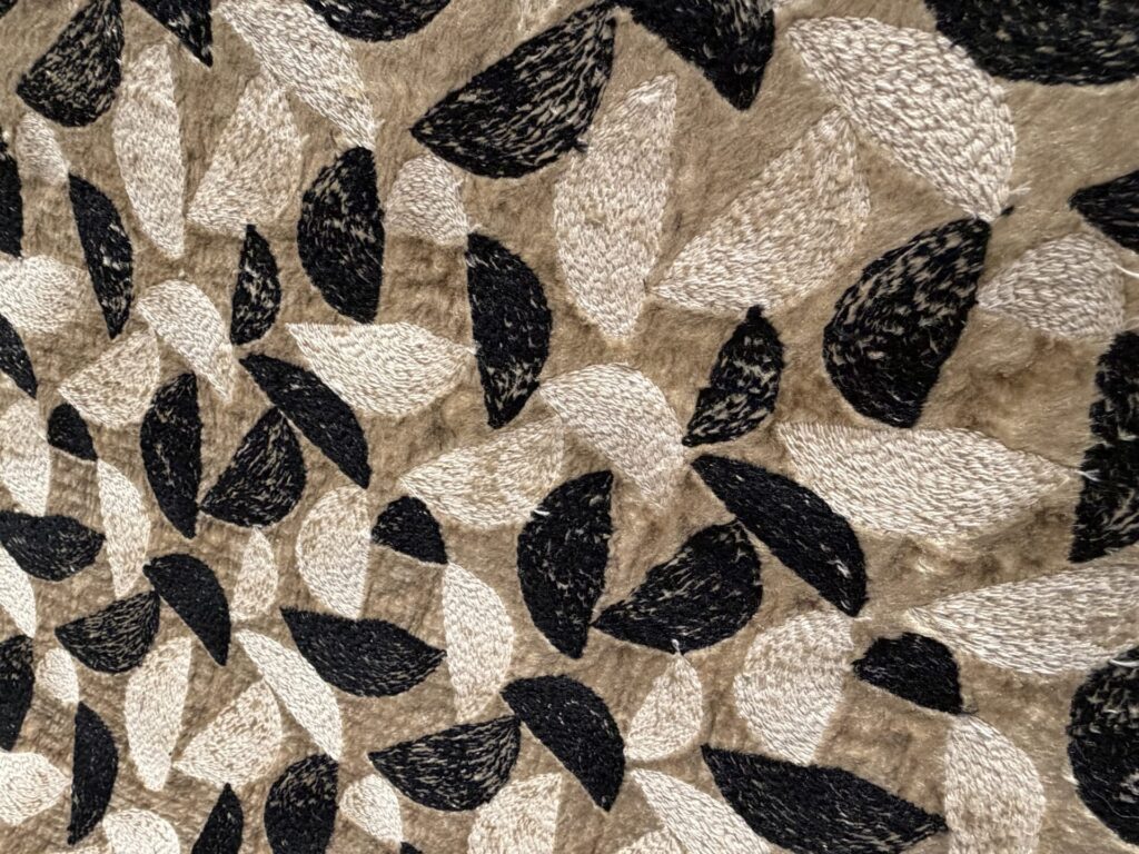 「ベルベットとウール素材をニードルパンチという技法で合体させた生地に、さらに刺繍をほどこしたテキスタイルである。異なる素材の生地を重ね、全面的に細かく針を刺し下の生地の繊維を上の生地にひっぱりだすようにして一体化させるニードルパンチ。柔らかで光沢のある表情の布地が生まれ、そこへさらにマットな風合いの糸で刺繍をほどこすことで、様々なテクスチャーを楽しむことができるデザインになっている。