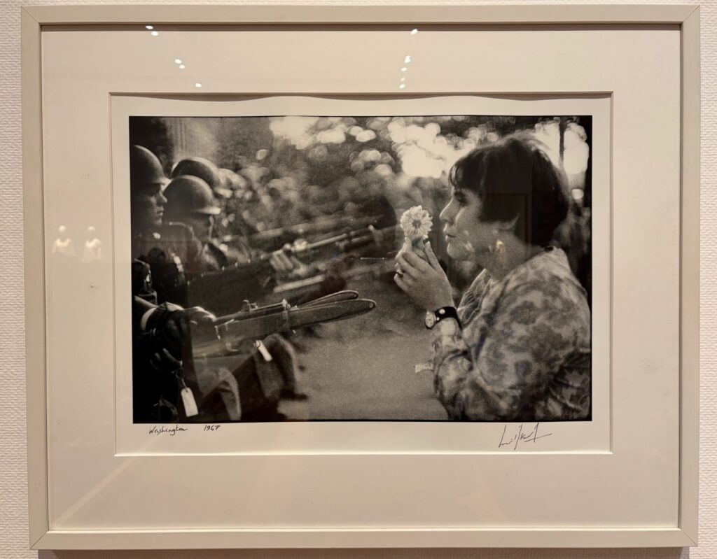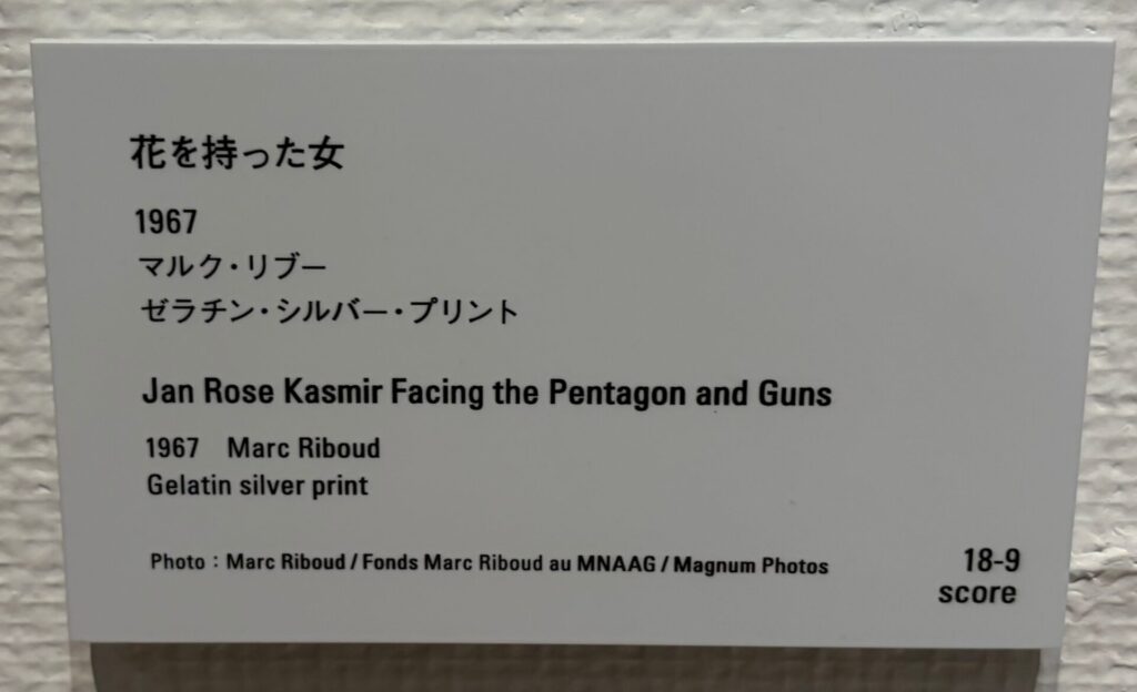 上記の解説にあった、「フランスの写真家、マルク・リブー(1923-2016)による「花を持った女」」も展示されていた。原題は「Jan Rose Kasmir Facing the Pentagon and Guns」であることを知り調べてみたところ、当時アメリカの高校生であったジャン・ローズ・カスミールを撮った写真で、「The Ultimate Confrontation: The Flower and the Bayonet (究極の対決:花と銃剣)」と呼ばれている作品だそうだ。