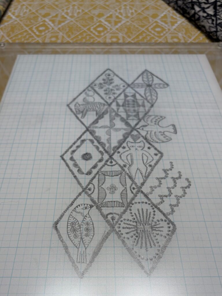 「動植物や幾何学的な文様が、規則的なひし形のパタンのなかに展開する、どこか伝統的な織物の図案を思わせるようなデザイン。整然と並びながらも、一つひとつの文様には手描きによる揺らぎが生じており、そこに素朴な味わいを生んでいる。