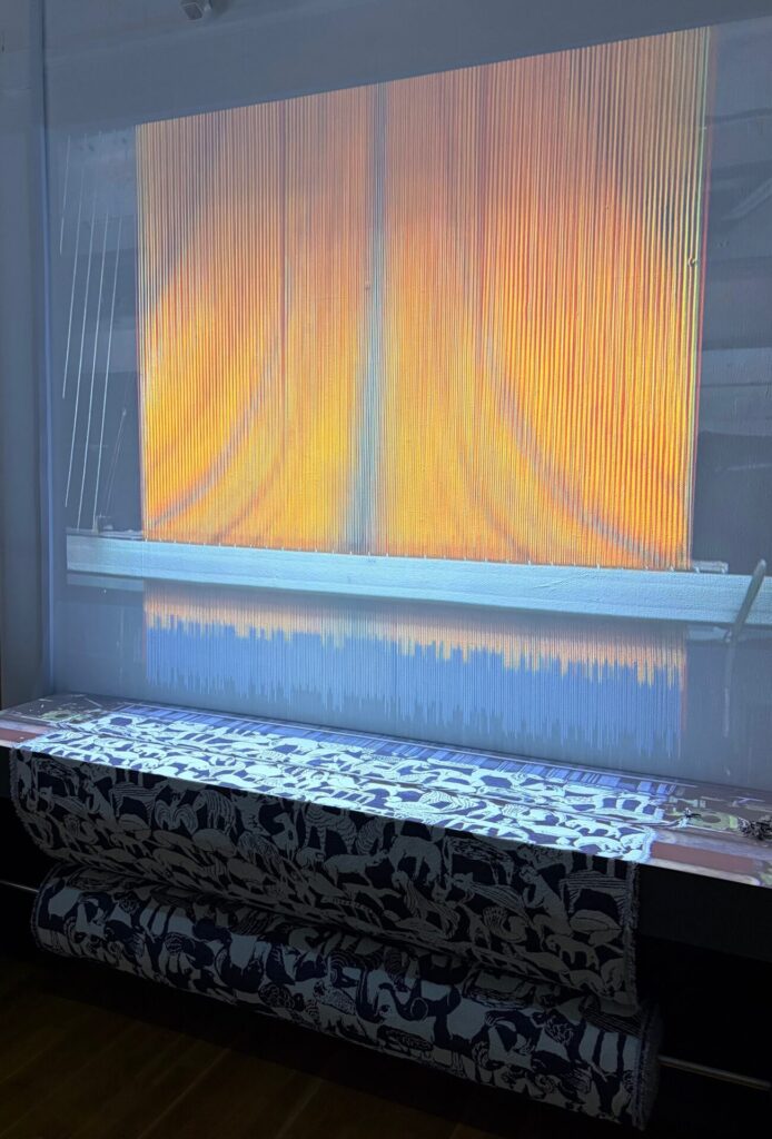 「ジャカード織は、経糸一本ずつが柄に合わせてそれぞれの動きで上下し、そこに糸を通して織ることで模様を表現する。それにより、チェックやストライプのような直線だけでなく、有機的な線も表現できるのが特徴だ。映像でも、縦に伸びたオレンジの糸の動きと、織り上がる柄の様子が連動している。織り機の端には刃がついており、テキスタイルの端の耳と呼ばれる部分を、織りと同時にカットしていく。」