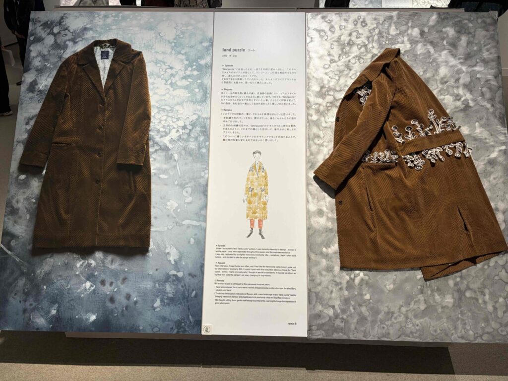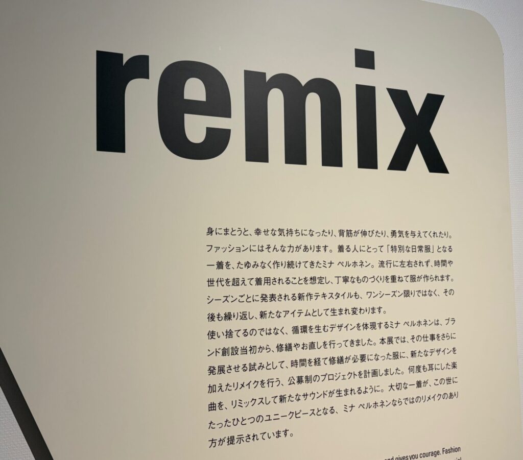 使い捨てるのではなく、循環を生むデザインを体現するミナ ペルホネンは、ブランド創設当初から、修繕やお直しを行ってきました。本展では、その仕事をさらに発展させる試みとして、時間を経て修繕が必要になった服に、新たなデザインを加えたリメイクを行う、公募制のプロジェクトを計画しました。何度も耳にした楽曲を、リミックスして新たなサウンドが生まれるように。大切な一着が、この世にたったひとつのユニークピースとなる、ミナペルホネンならではのリメイクのあり方が提示されています。」
