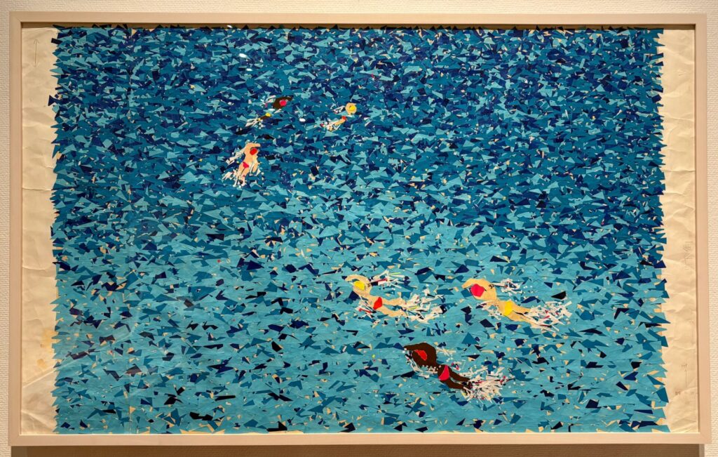 「勢いよくあがる水しぶき、光を反射した水面の煌めき。変化に富む水と光の表情を細かい切り紙で表現した原画は、その微細な色の濃淡にいたるまで再現しようとしている。プリント工場の技術によって実現したテキスタイルは、2003年ミナペルホネンに入社したばかりのデザイナー・田中景子によるもの。田中が選んだモチーフは、トライアスロンだった。「肌の色の違う世界各国の人々が自分自身と戦いながら大海原を泳いでいる姿」を、自らに重ね合わせて制作したのだという。