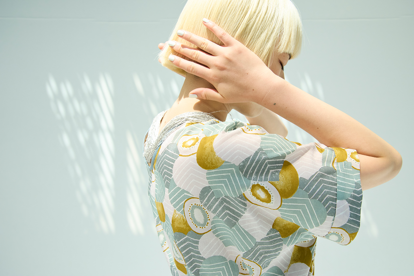 年々ヒールの靴を履く機会が減り、低身長の自分にはハンサムなスタイルが少し似合わなくなってきたように感じています。それでも、“land puzzle”のテキスタイルが好きで手放せずにいた一着。だからこそ印象を変えて、今の自分にも似合う一着として生まれ変わったら嬉しいなと思いました。