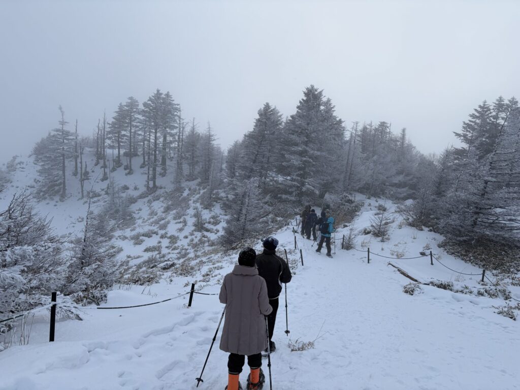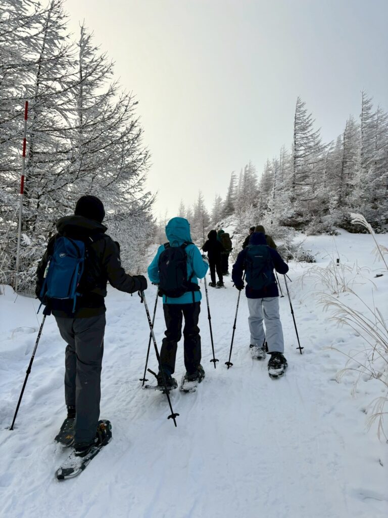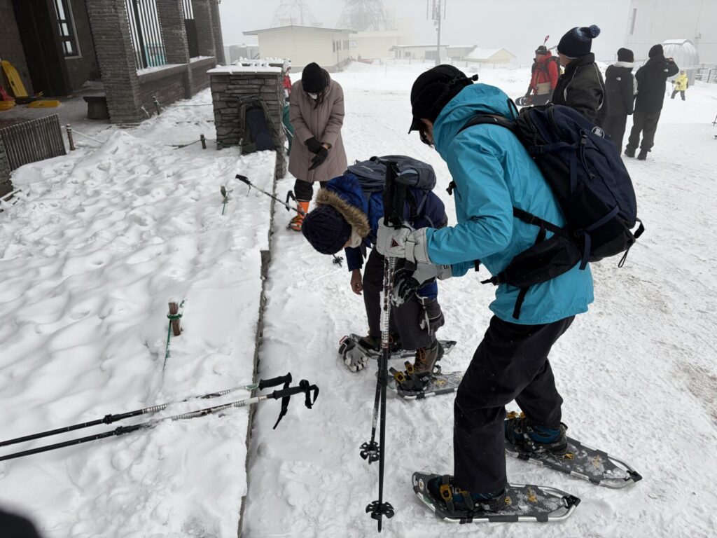 もっと大変かと心配していたが意外と簡単に履けた。スノーシューとポールは貸してもらえる。↓