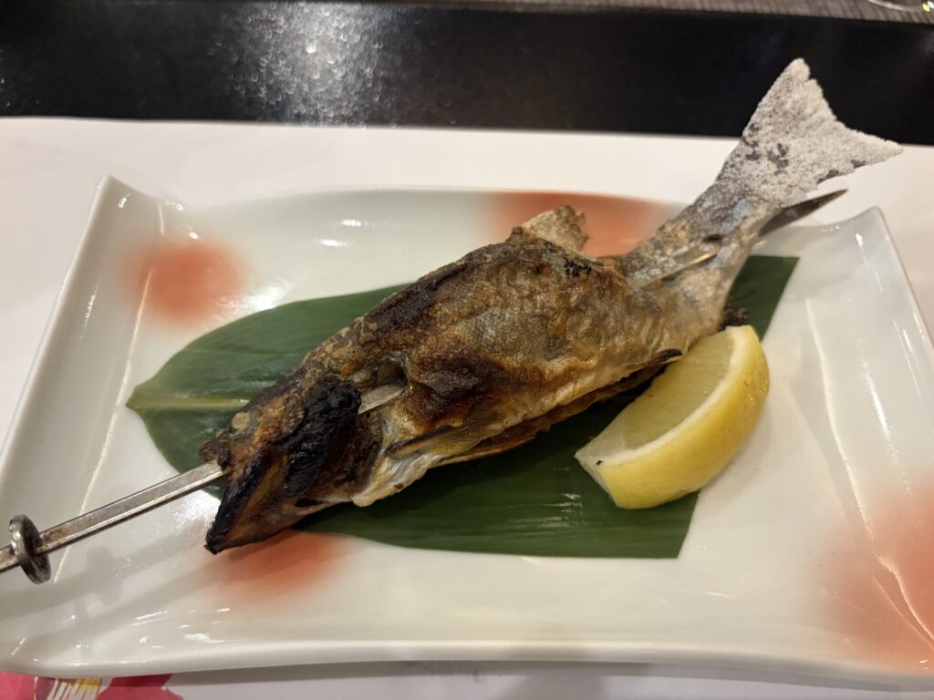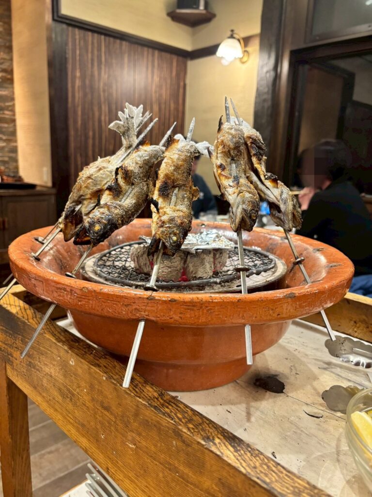 ヤマメの塩焼きはこんな風にして熱々の状態でサーブしていただける。↓