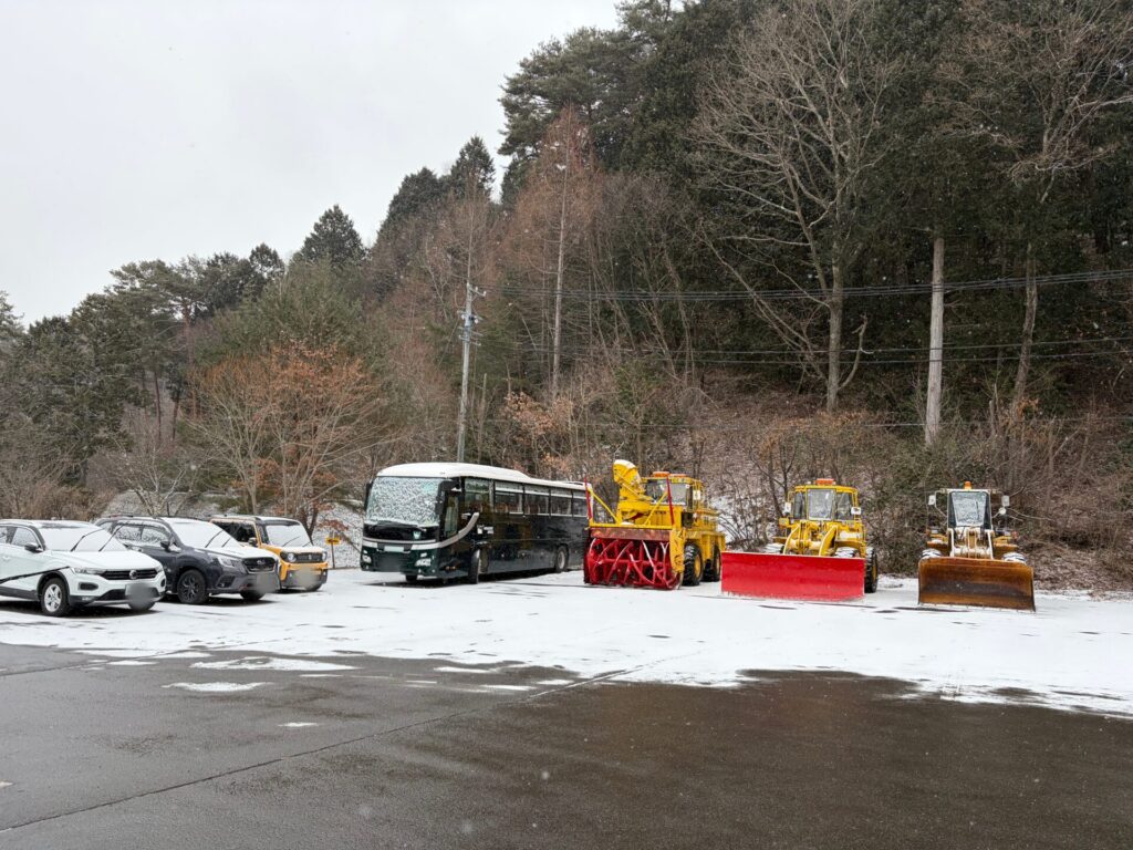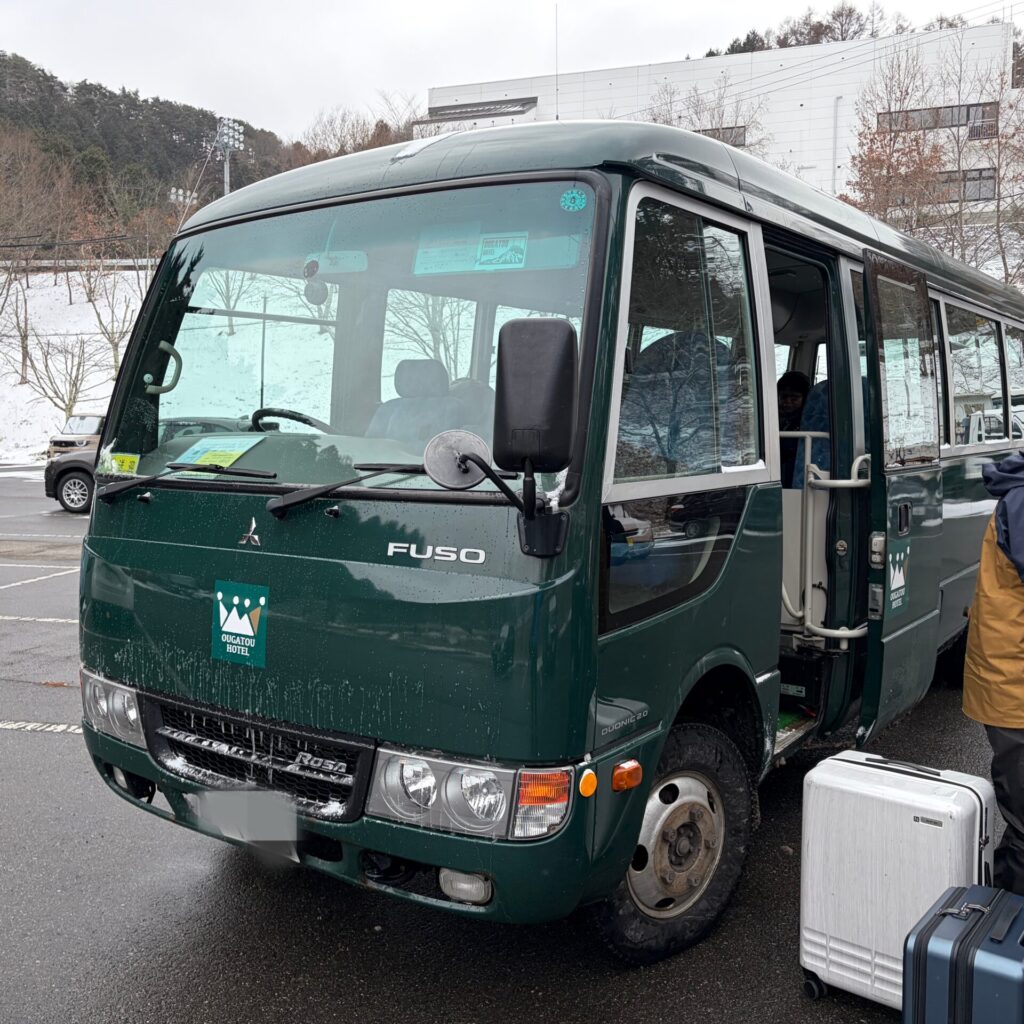 冬の場合は、最寄りの美鈴湖の駐車場まで自家用車で来て、そこにクルマを置いて、ホテルの迎えのバスに乗って往復する。↓