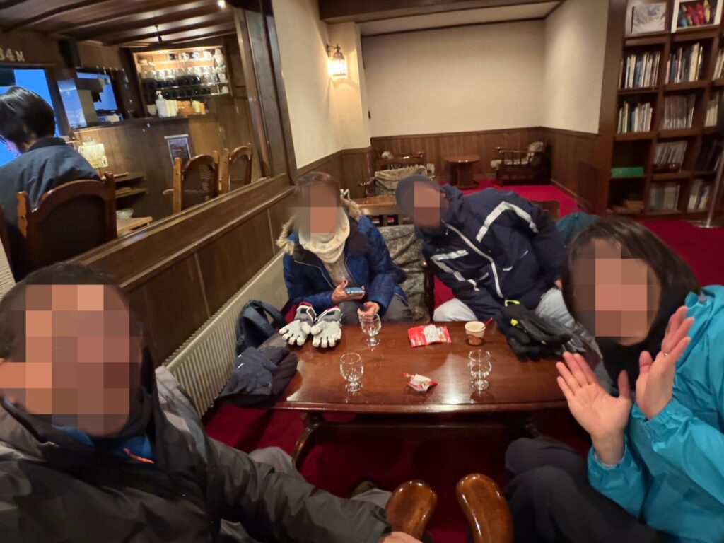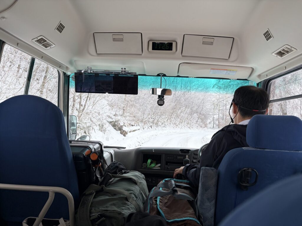 王ケ鼻からスノーシューで少し戻ったところにホテルのバスが迎えに来てくれるのでありがたい。