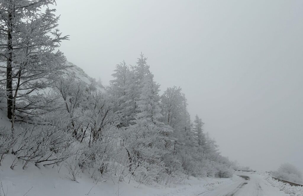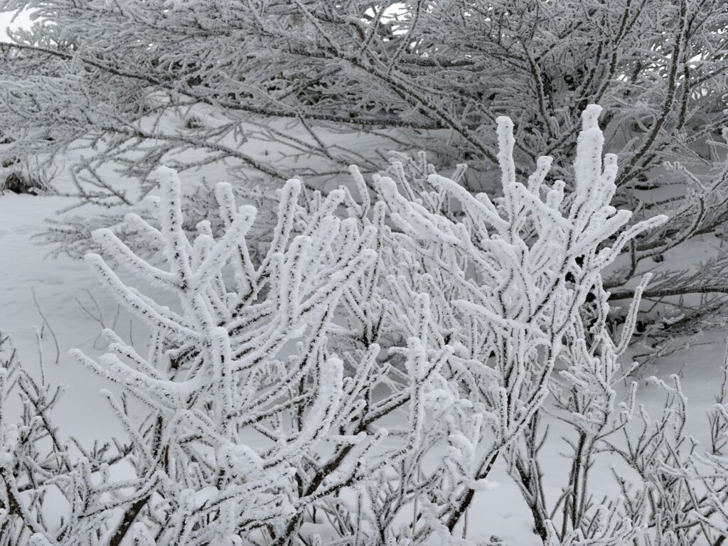 昨日の夜に雪が降って木々の白さが増している。↓