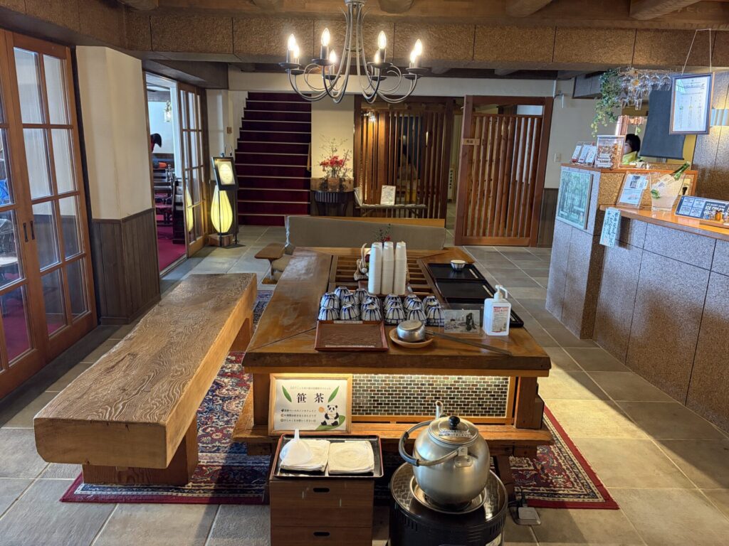 天日干しした美ヶ原の信濃笹でつくった「笹茶」がやかんに入れられて無料で飲める。↓