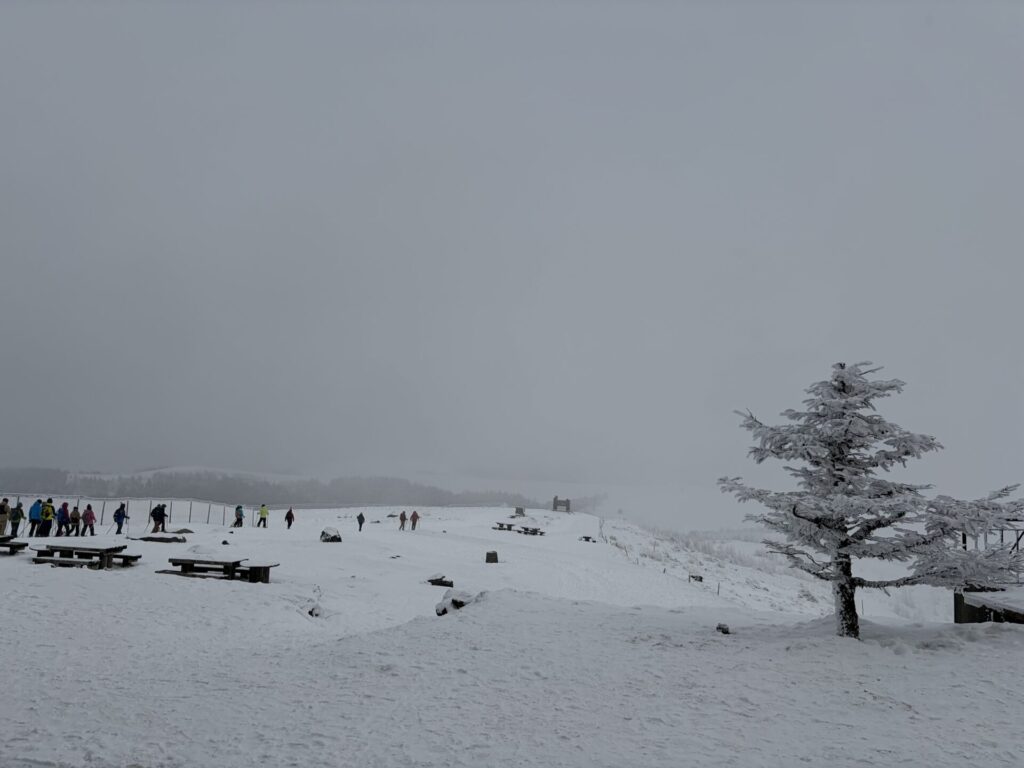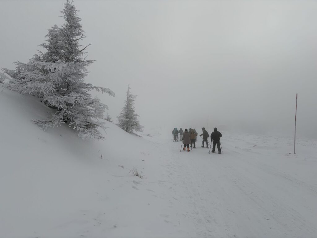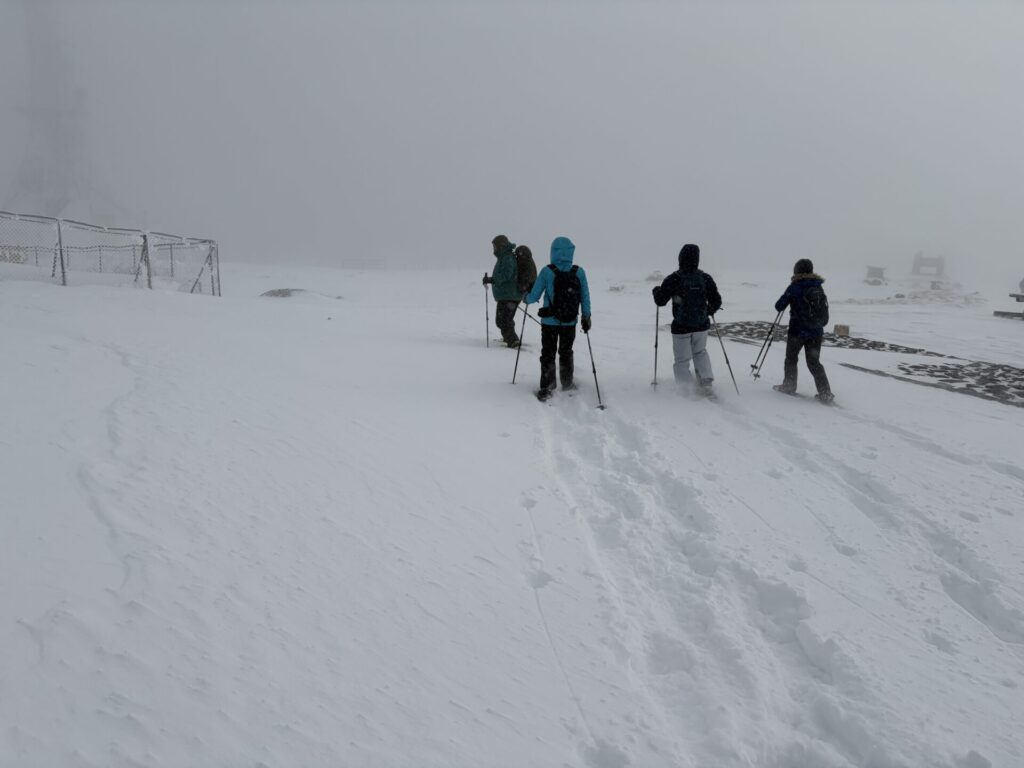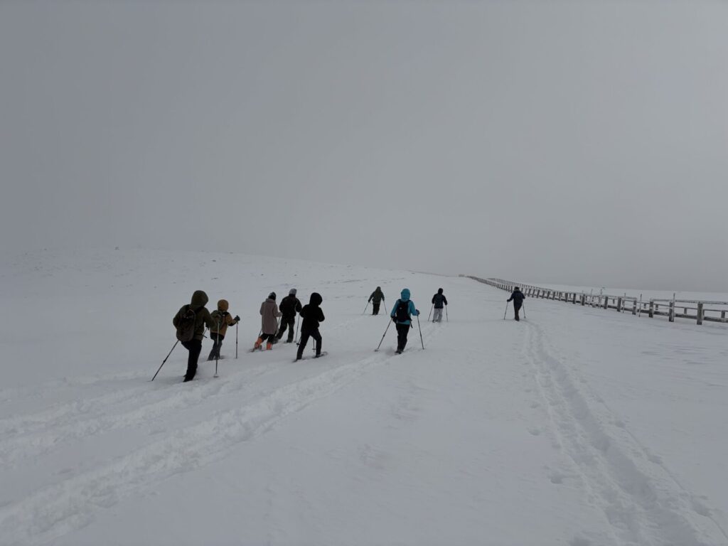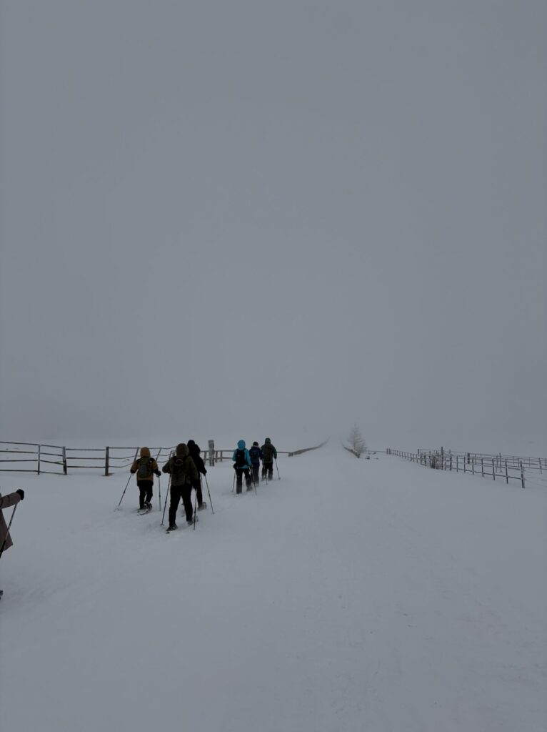 スノーシューに出かける人たちの列が見える。