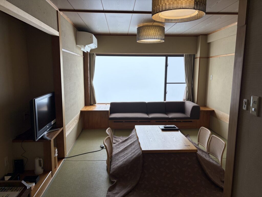 風呂から絶景を眺めるのも楽しみにしていたのだが、今回は真っ白で残念だった。↓