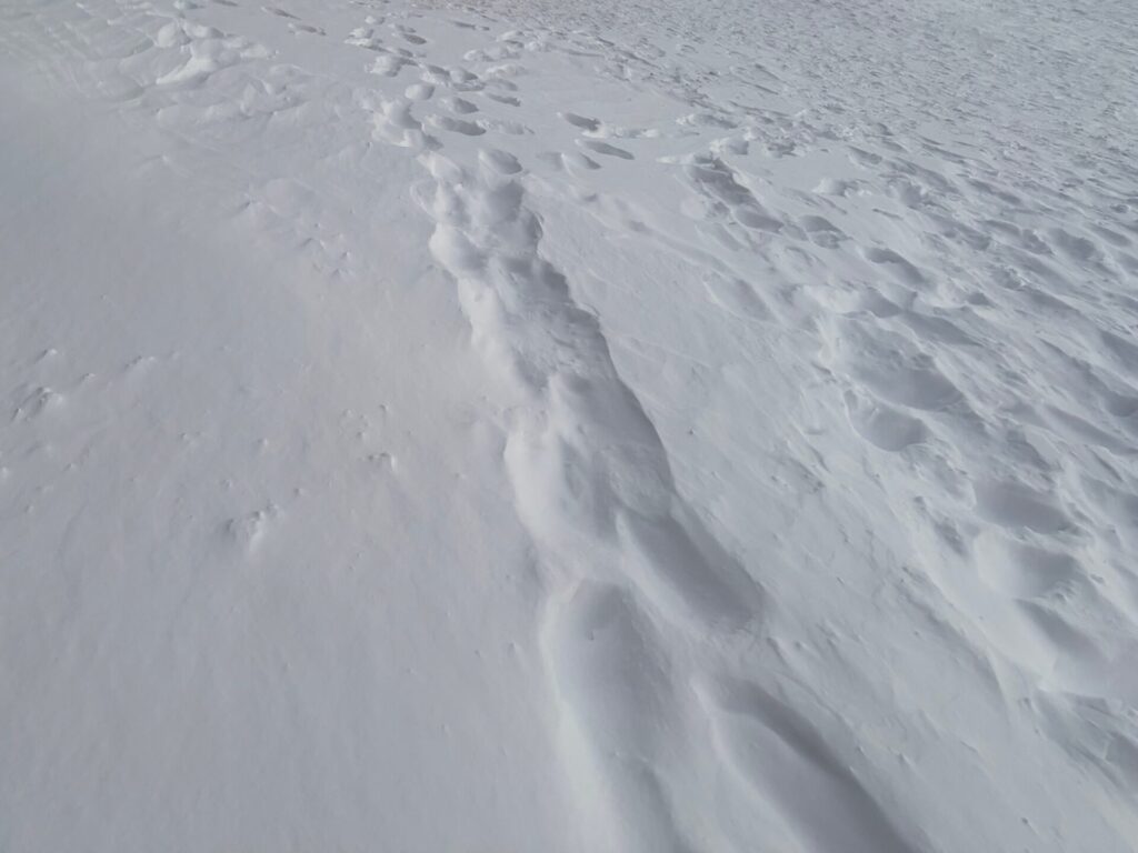 風が生み出す雪面の模様が美しかった。↓