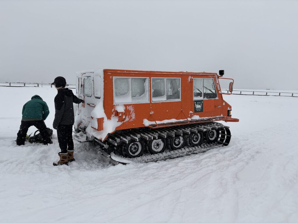 約2時間の散策終了。今日の帰りは雪上車が迎えに来てくれた。↓
